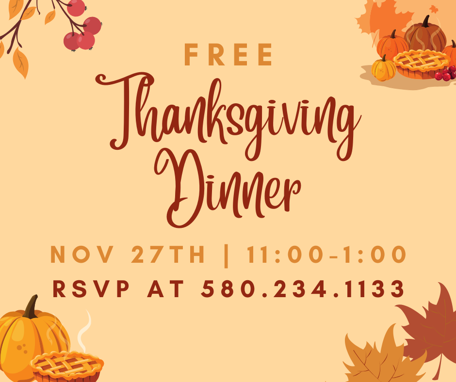 Join us on Thanksgiving Day for a FREE dinner! RSVP by calling 580.234.1133!